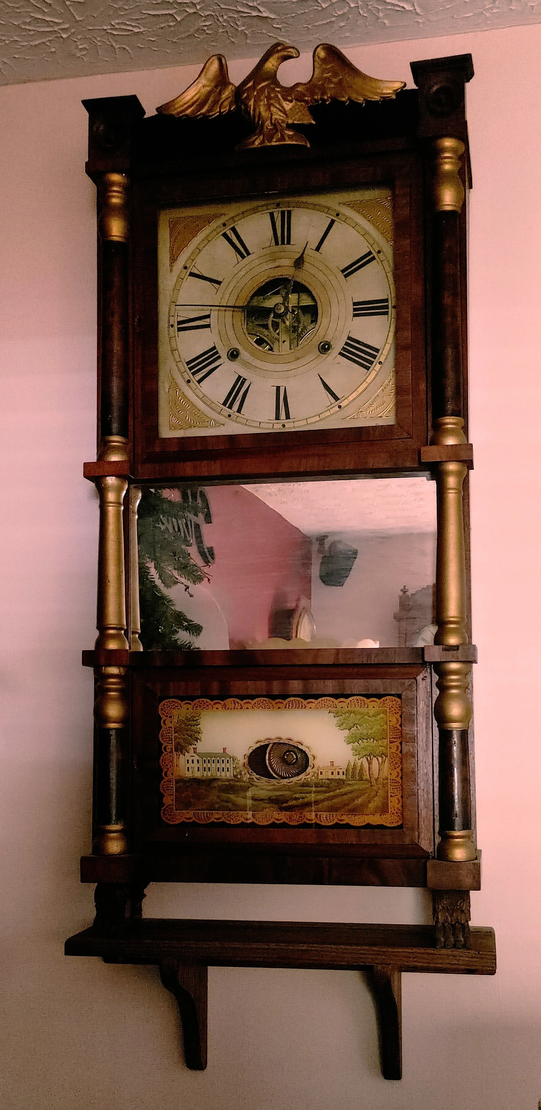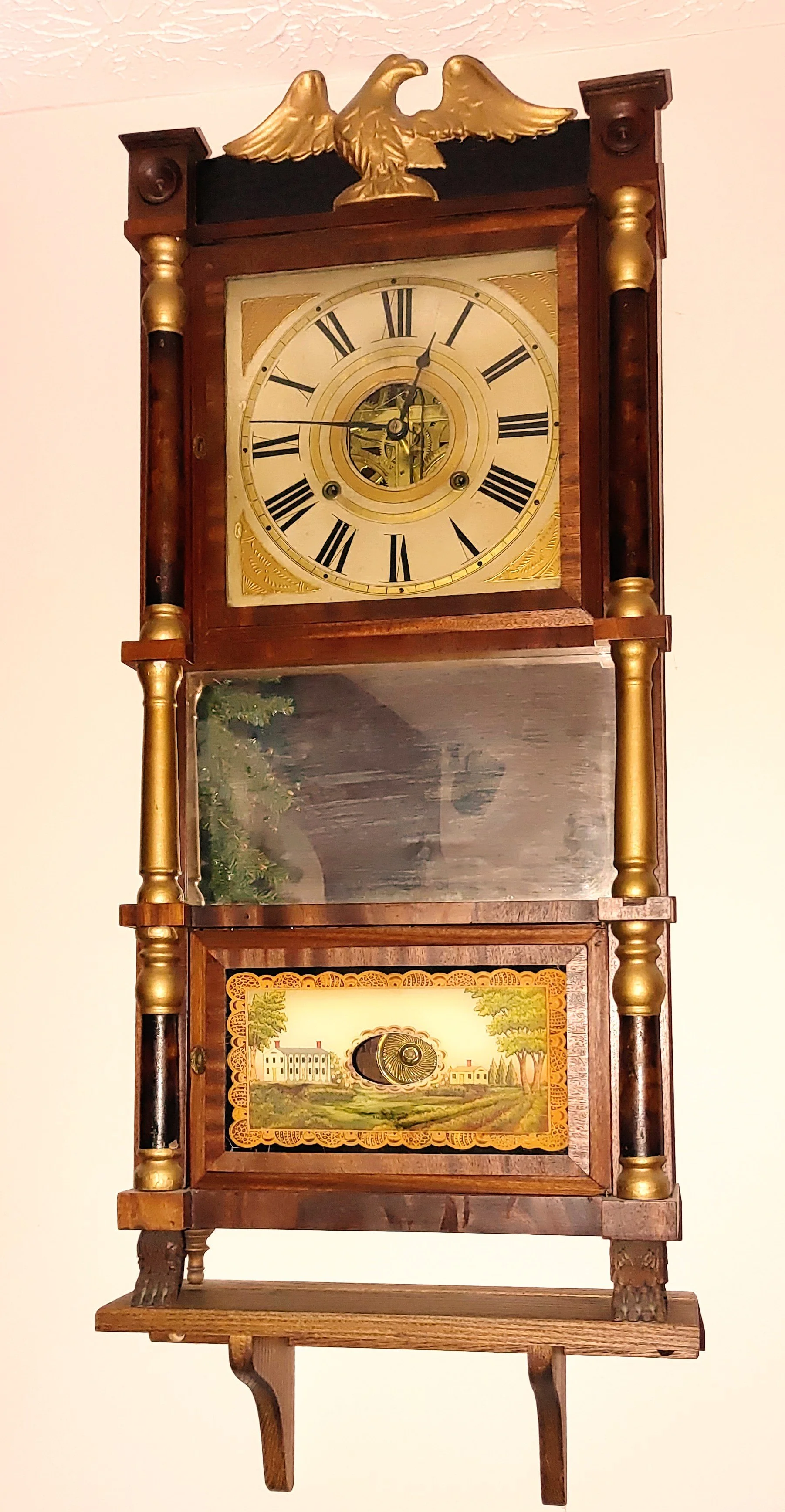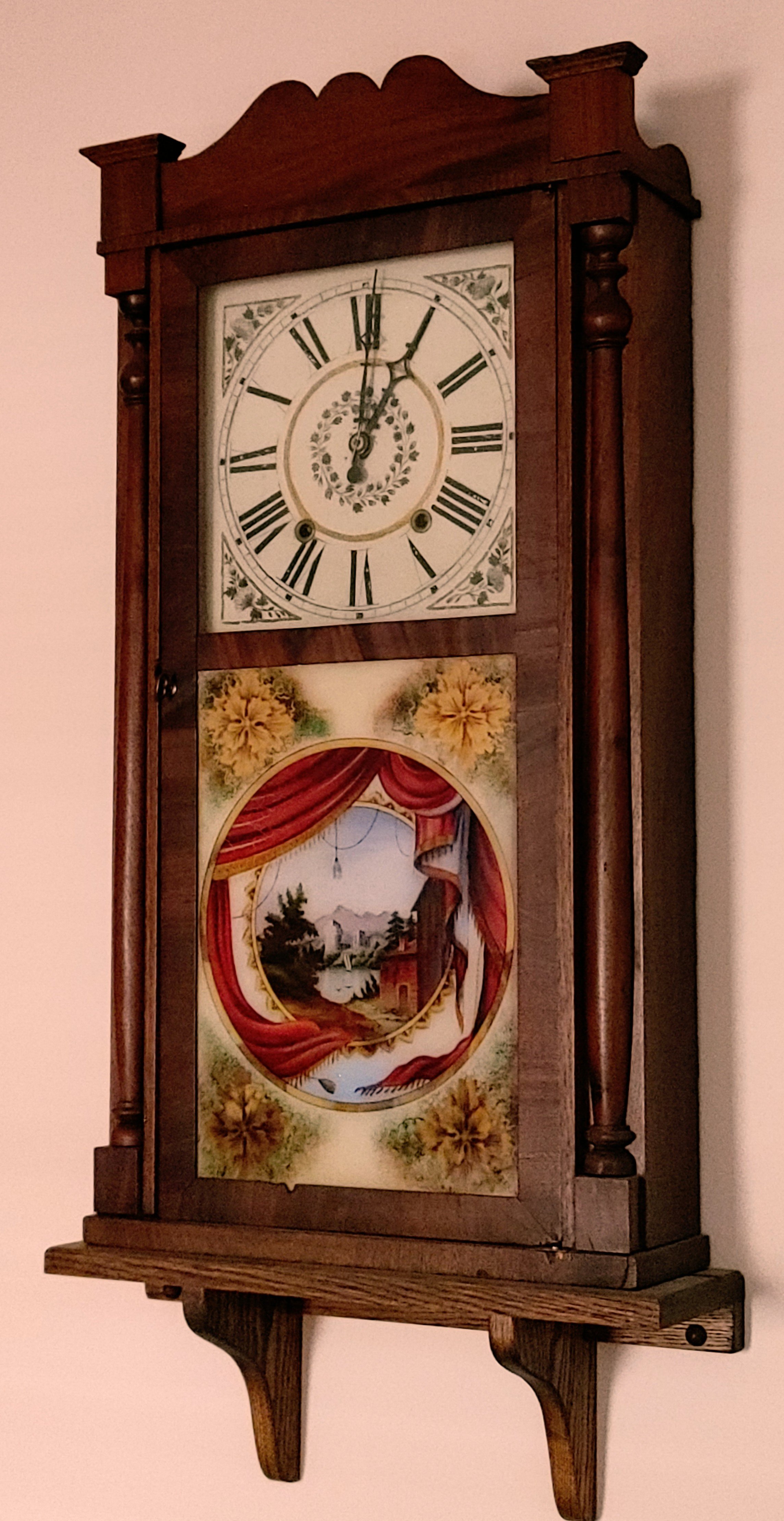 This early American mantle clock has beautiful reproduction “reverse” painted glass tablets, everything else is original. Although this is a mantel clock it can be placed on a wall using a small shelf like you see pictured below.