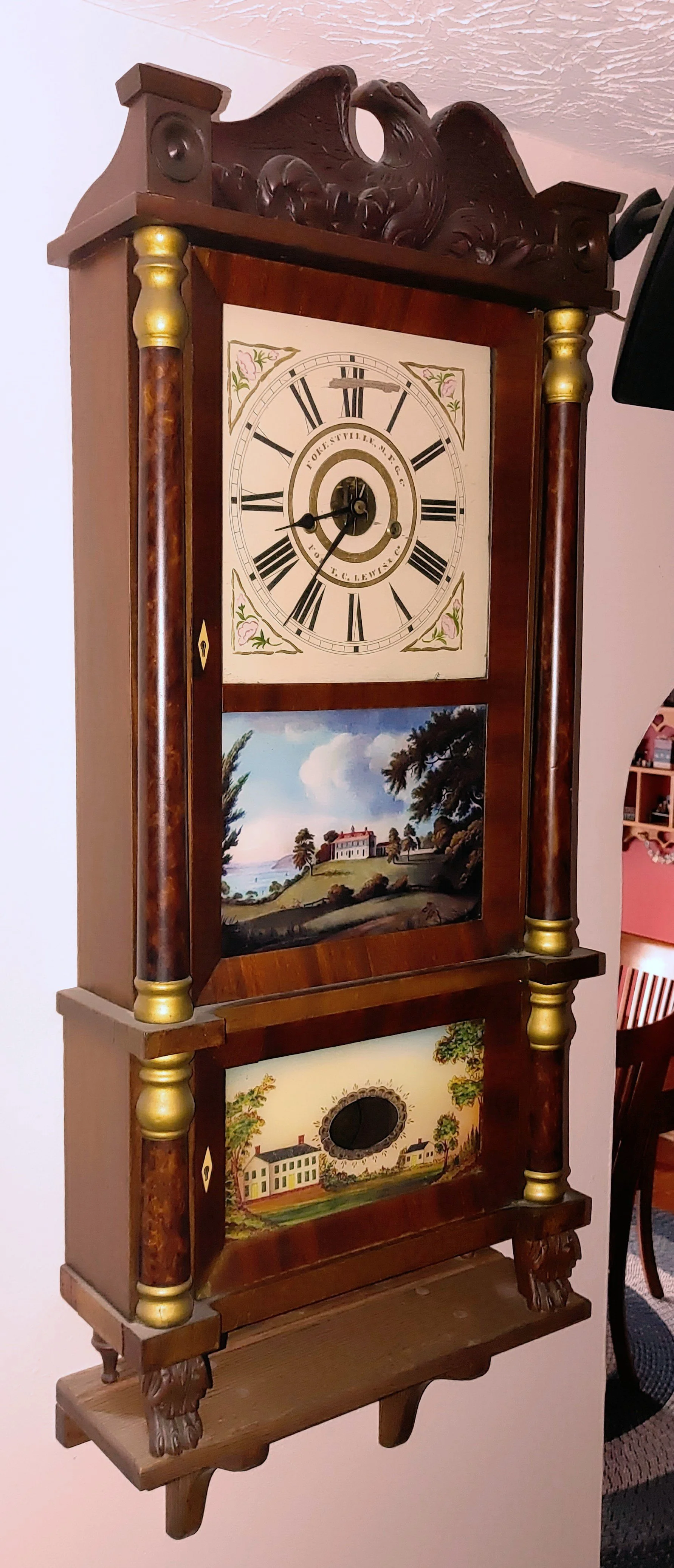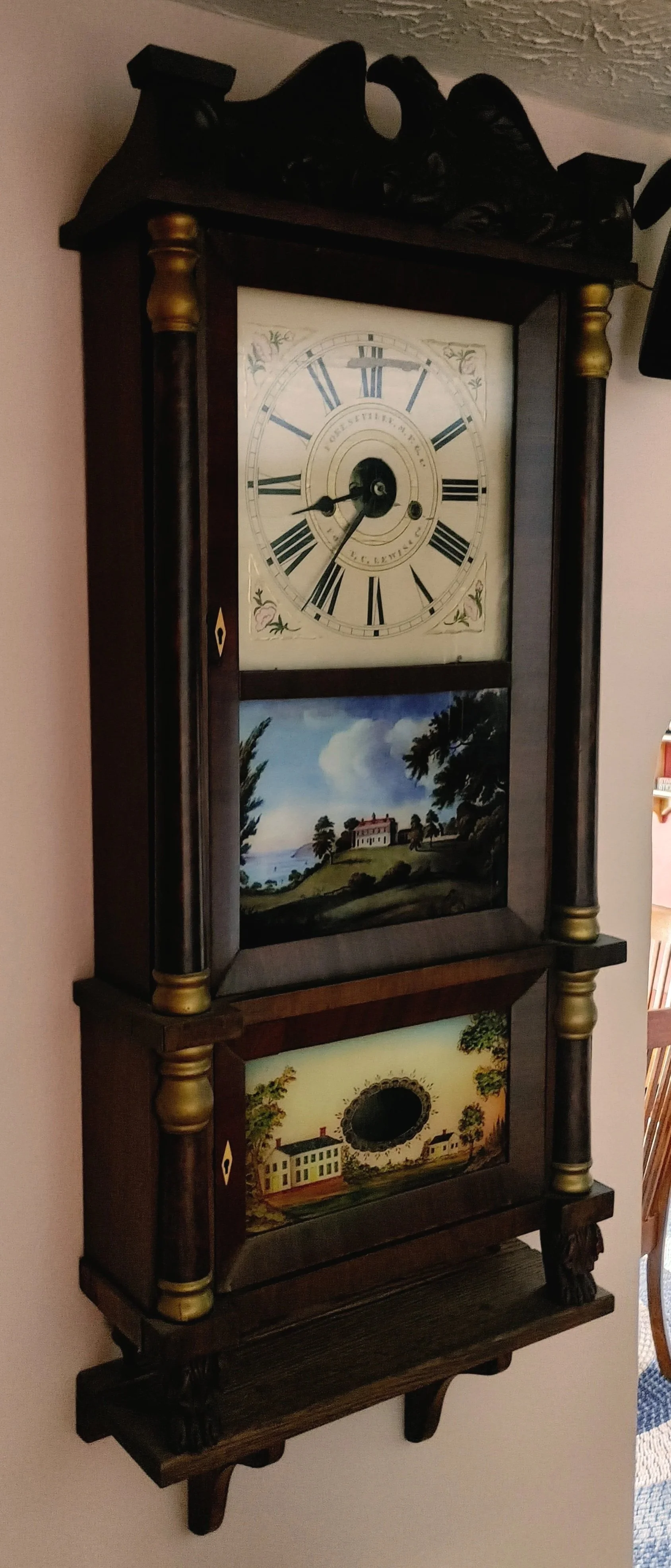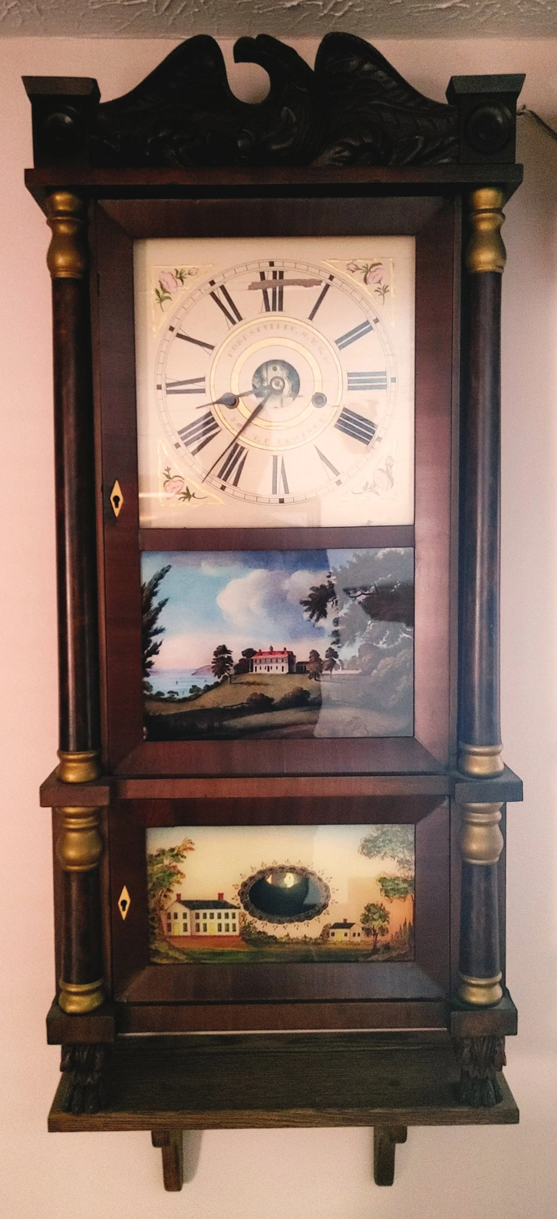 This early American mantle clock has beautiful reproduction “reverse” painted glass tablets, everything else is original. Although this is a mantel clock it can be placed on a wall using a small shelf like you see pictured below.