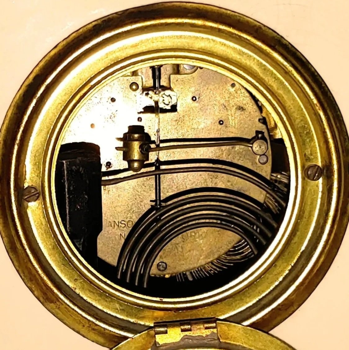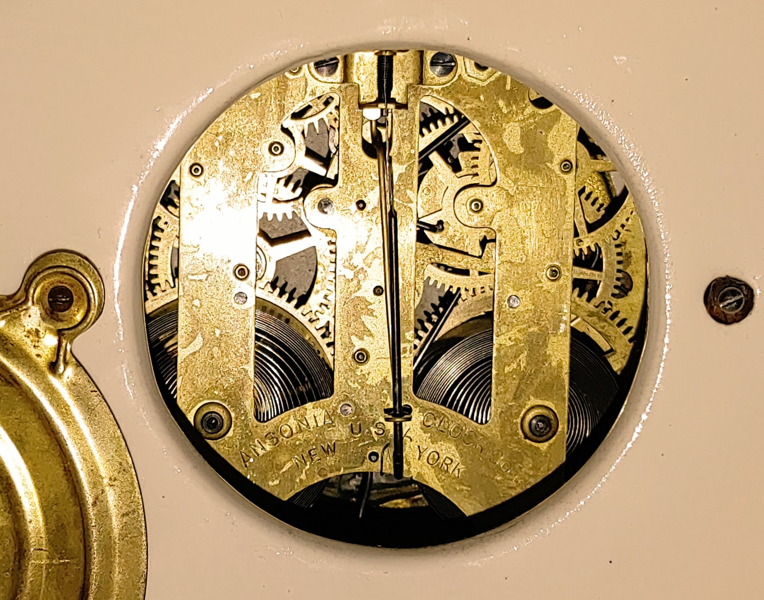 This stunningly beautiful clock is made by the Chelsea Clock Company, the last large-scale manufacturer of American made clock movements. Chelsea is known for their high-quality ship’s bell movements and cases. Unlike most brass ship’s bell cases, which are made of sheet brass, Chelsea cases are machined from a solid chunk of brass and are surprisingly heavy when picked up. I sent this case back to Chelsea where they restored the brass case back to its original glory.