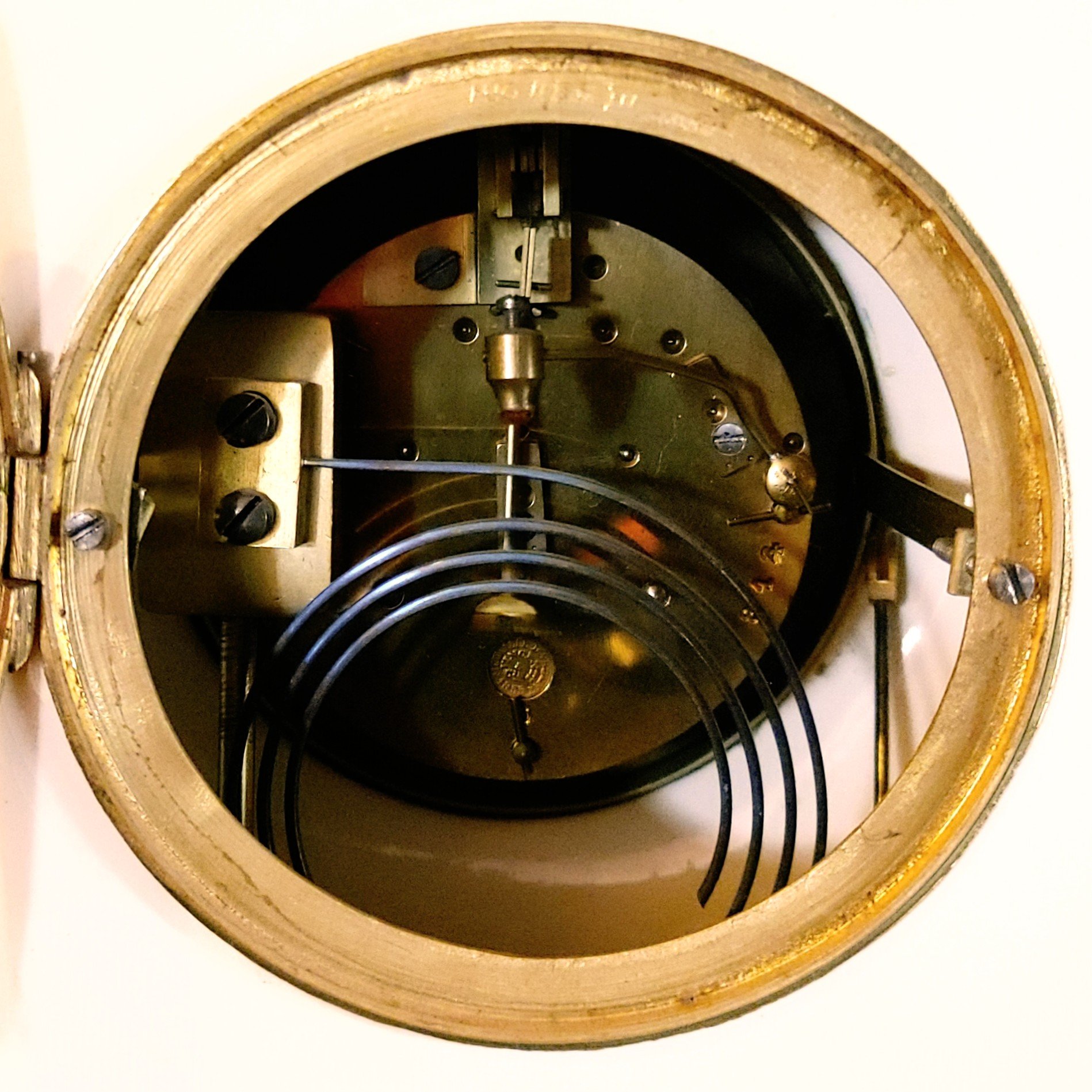Features: Half hour and hour count wheel strike on gong - This clock has a special “Jacot” pendulum. This style of pendulum is much rarer as it has an indicator hand to show how much difference is being made when regulating the clock for better accuracy. Unfortunately, the delicate pointer is often broken (like this one) by the owner attempting to turn the hand by itself instead of using the knob in the center to regulate the clock. The tail of the indicator is still present - See photo - The clock also has an alarm visible in the photo showing the pendulum